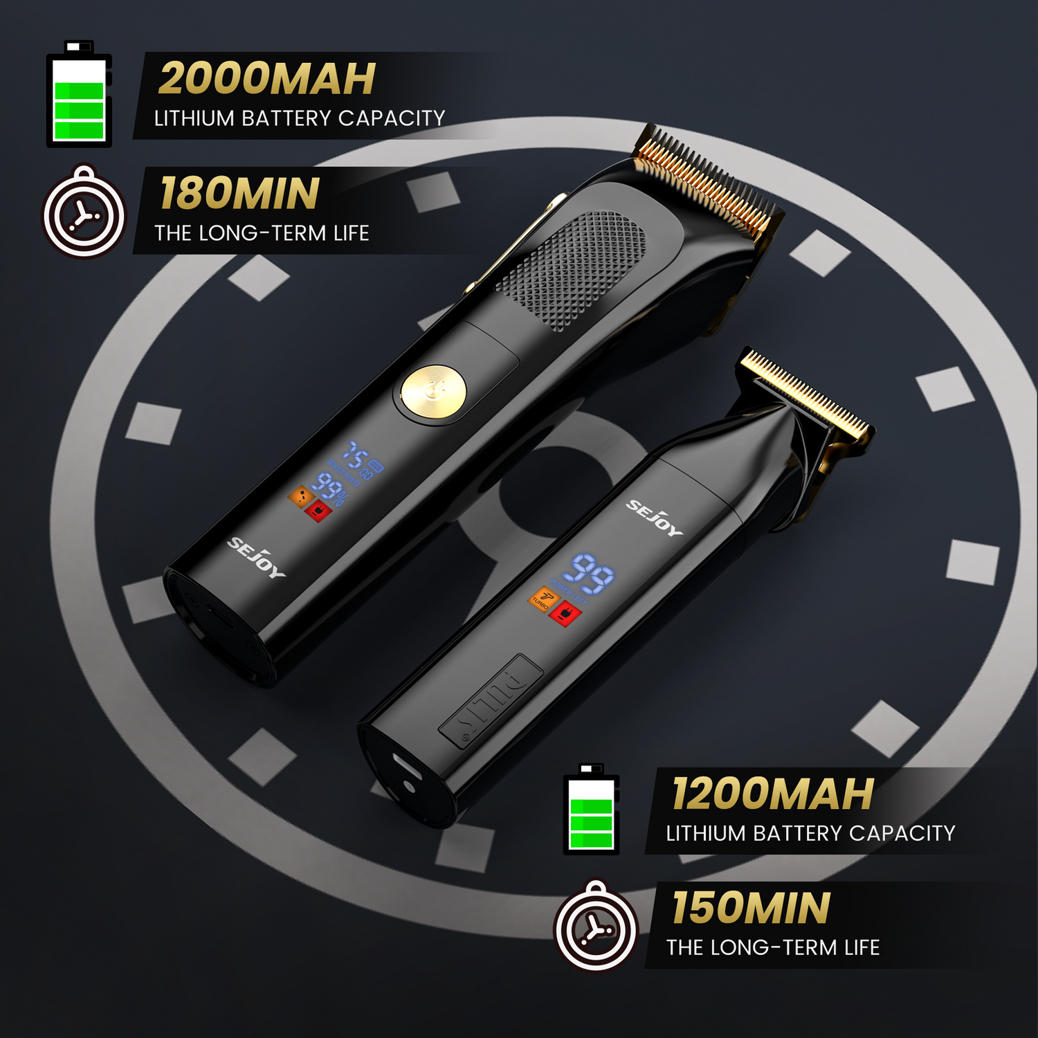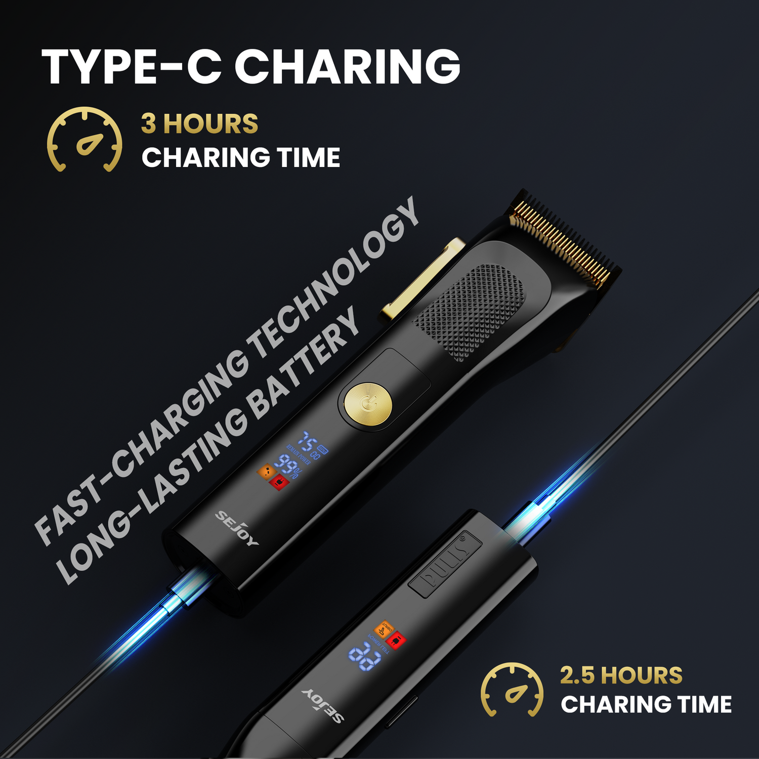 - Features : 440C Stainless Steel Blades,6000-6800RPM High Power Motor,2000/1200 Lithium Battery Capacity,LED Display,Type-C Fast Charging,3-Speed Control Hair Clipper,2-Speed Control-T-Blade Trimmer,Guided Combs for Clipper (1.5/3/4.5/6/10/13/16/19mm),Guided Combs for Trimmer (1/3/6mm),Adjustable Taper Lever