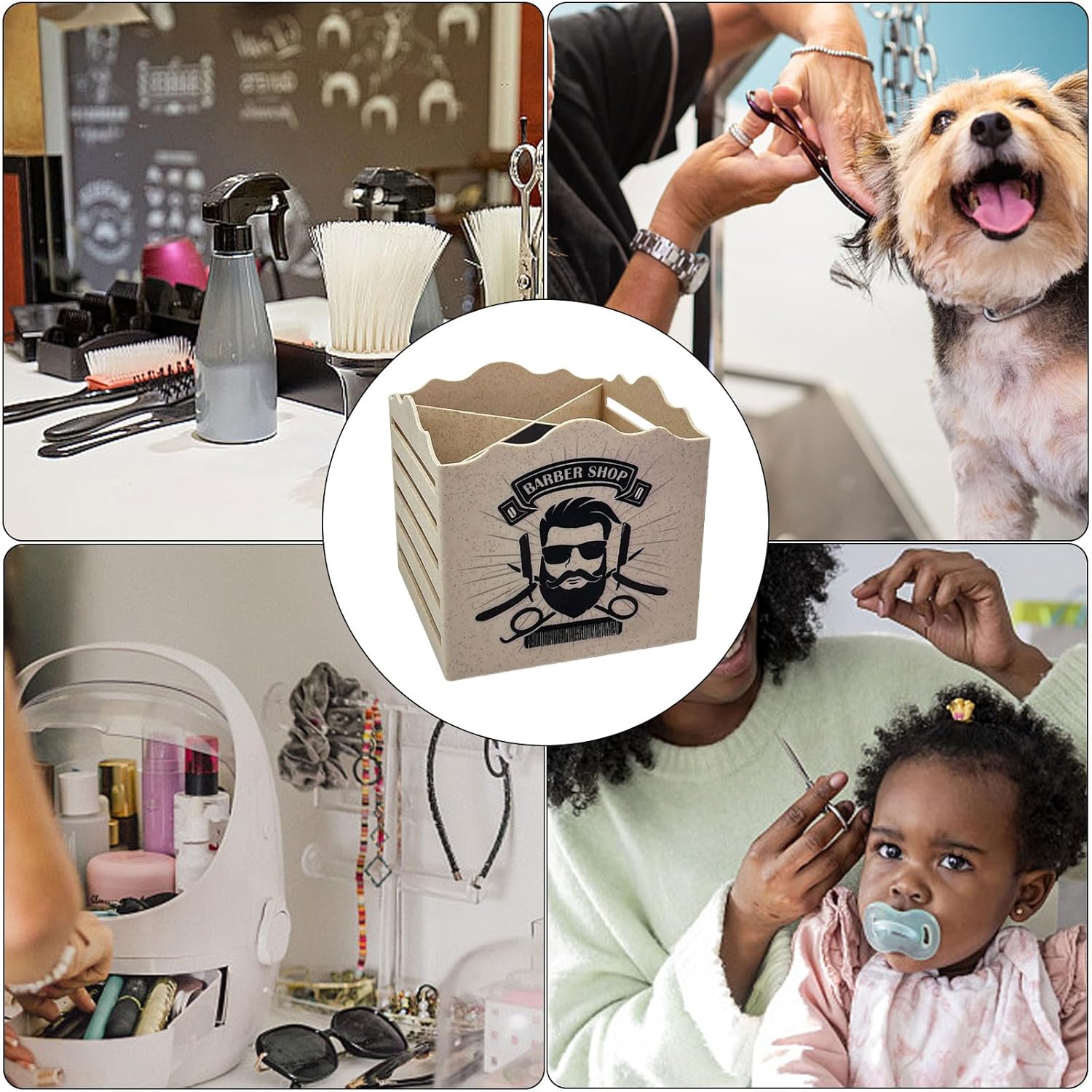 The holder features four compartments in different sizes to accommodate scissors, combs, and clips. A removable sponge insert securely holds tools in place and allows for easy cleaning—helping remove trimmed hair and maintain hygiene. Suitable for bathrooms, dormitories, hotels, offices, and pet grooming stations.[Keep Tools Neat and Protected]