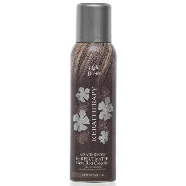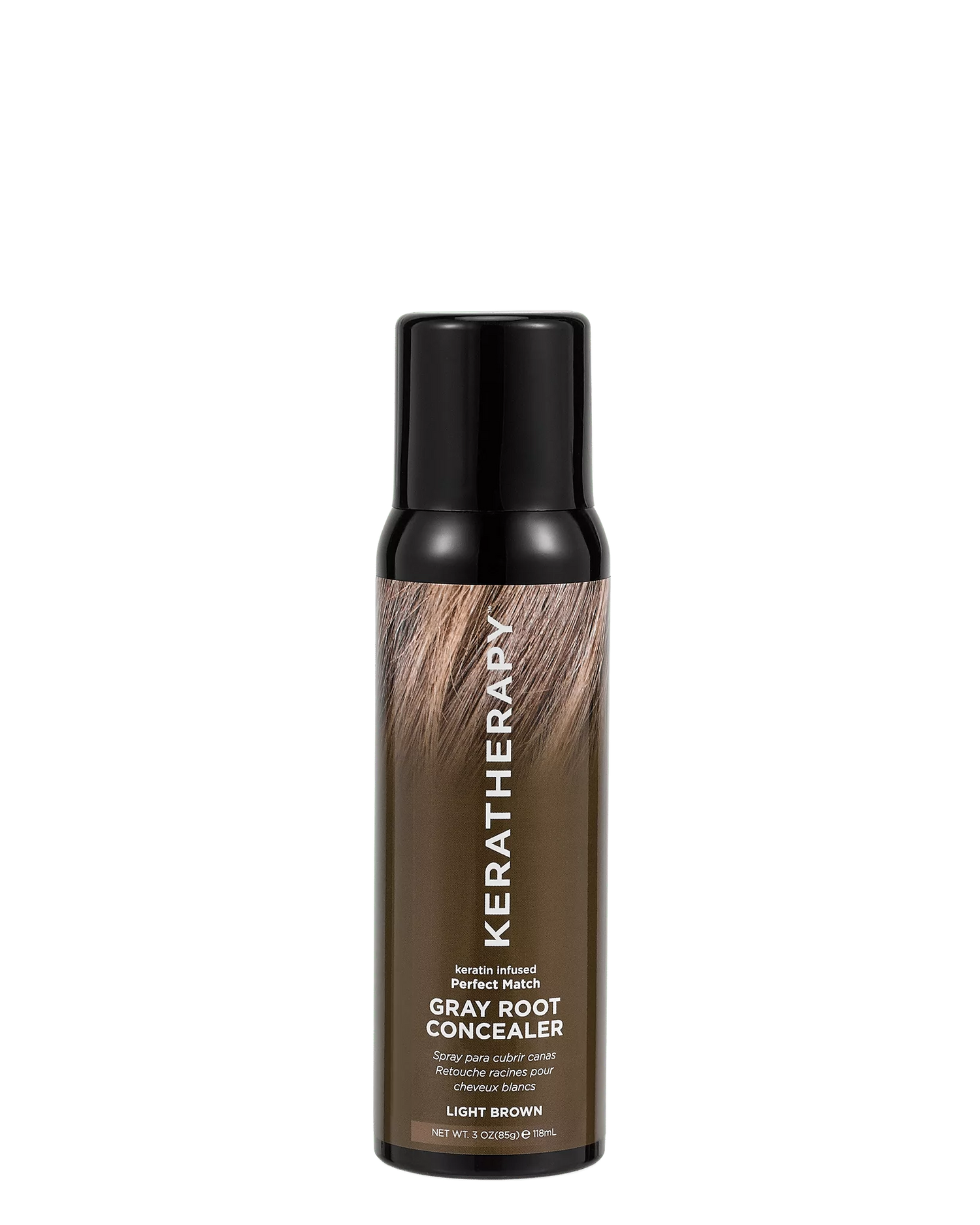 Keratherapy's Gray Root Concealer for Light Brown colored hair temporarily covers up gray roots with an easy spray on application that lasts until the next time you shampoo your hair. Color matching technology perfectly conceals gray roots, extending the amount of time you can go between hair coloring treatments, and reducing the damaging impact that repetitive dying can have on your hair.BENEFITS
