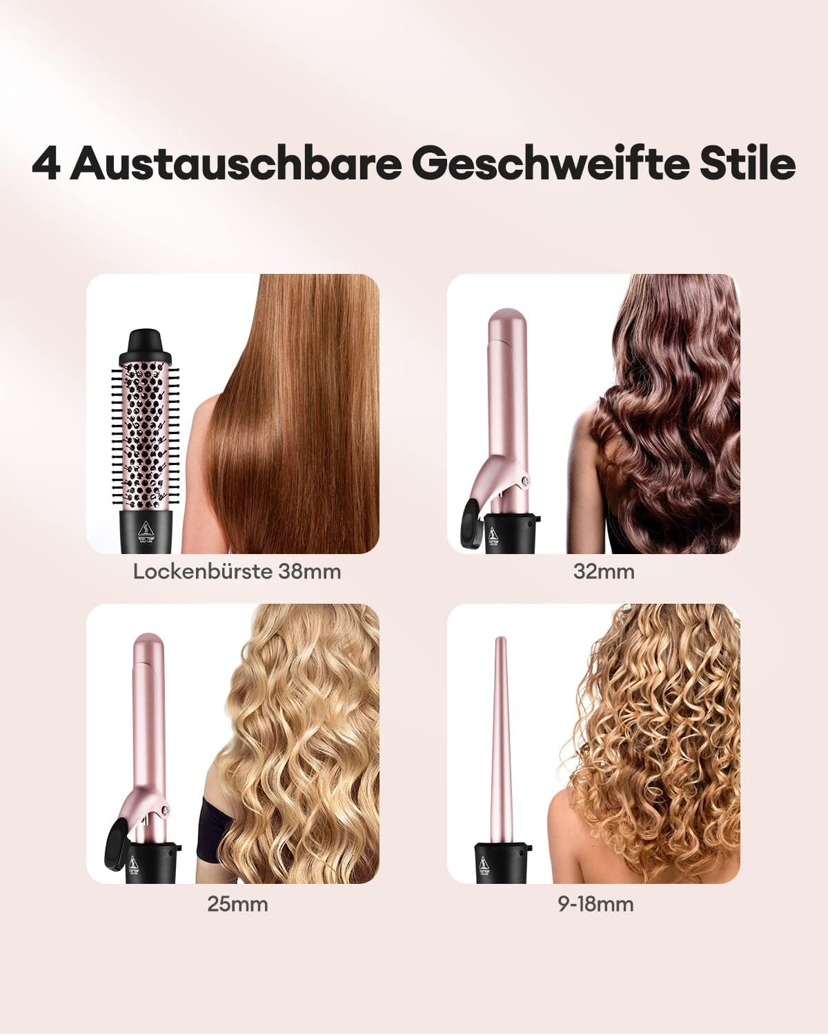Versatile Styling: Includes 4 ceramic-coated barrels for multiple curl styles – 38 mm curling brush, 9–18 mm conical wand, 25 mm & 32 mm cylindrical irons. Ideal for loose waves, tight curls, and voluminous styles.