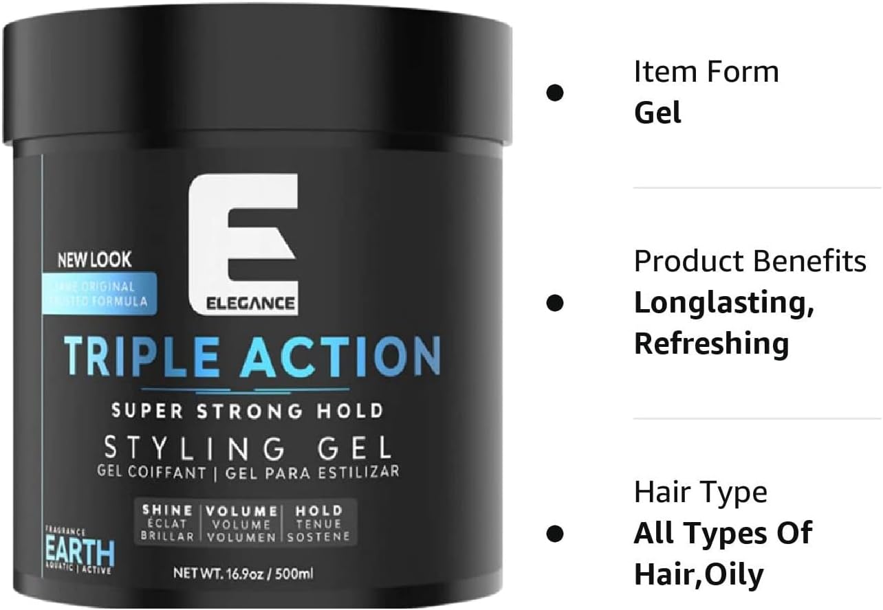 The Elegance Triple Action Hair Gel – 1000ml Blue delivers barber-quality hold, hydration, and shine, making it an essential styling gel for those seeking frizz-free, long-lasting styles with a clean finish.