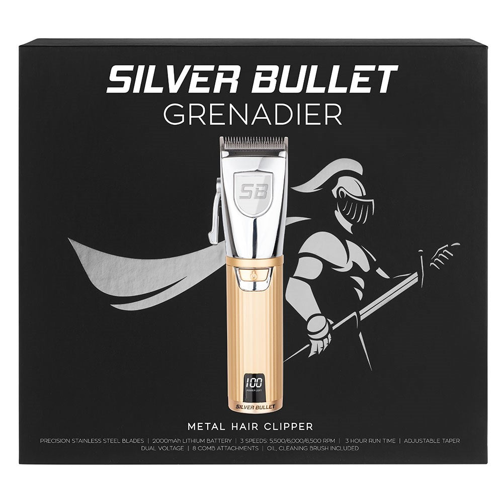 Elite performance in shining armour. Silver Bullet Grenadier Metal Hair Clipper Gold is an outstanding salon clipper for all hair types. This is a retro metal clipper with cutting edge features, including multiple speed settings up to 6,500 rpm to suit every client’s needs. Stainless steel blades for impeccable precision and all-day usage without overheating. 2,000 mAh lithium battery for 3 hours cordless runtime without compromise. Adjustable taper, 8 comb attachments and a digital display. Precision without the price tag, Silver Bullet Grenadier Metal Hair Clipper awaits your command.