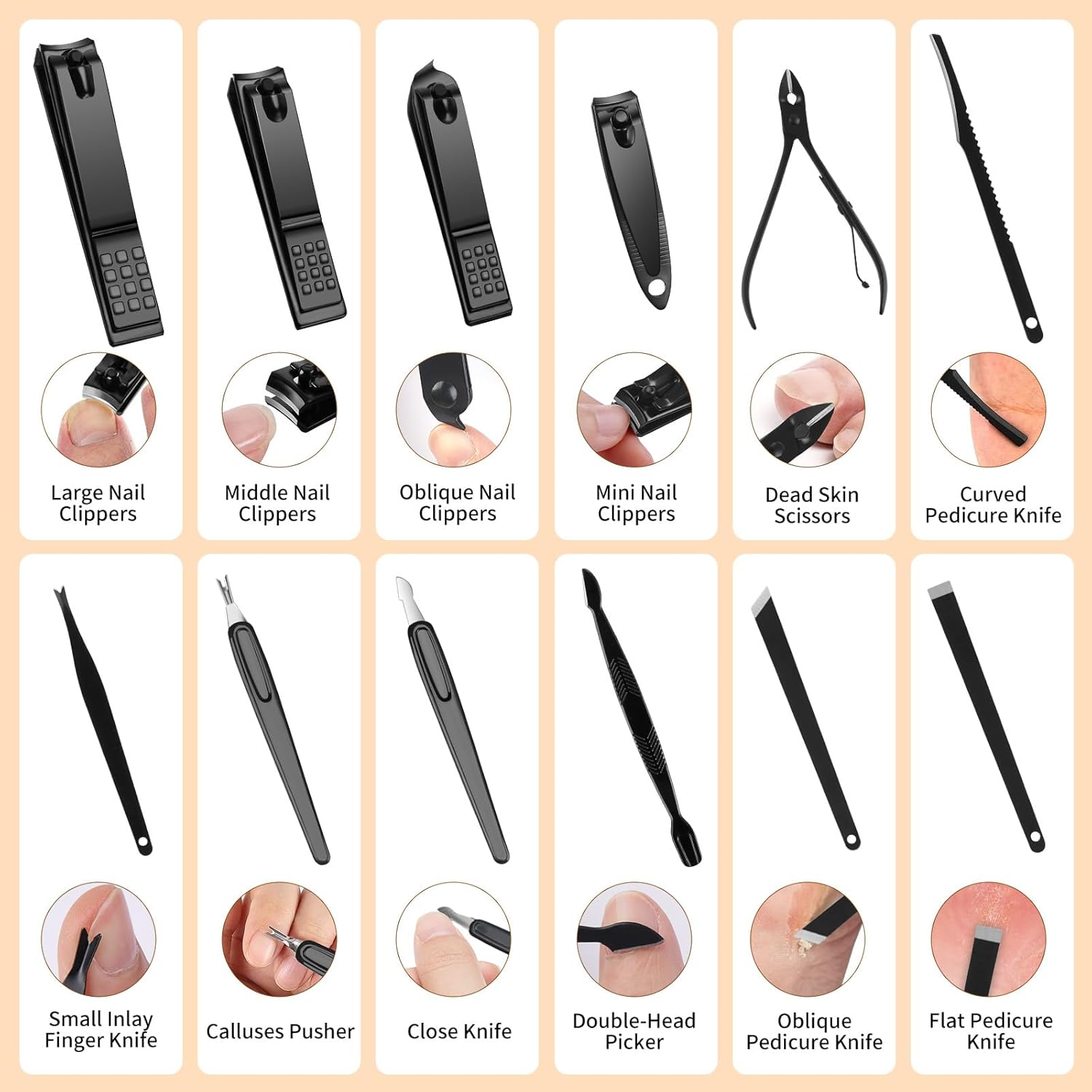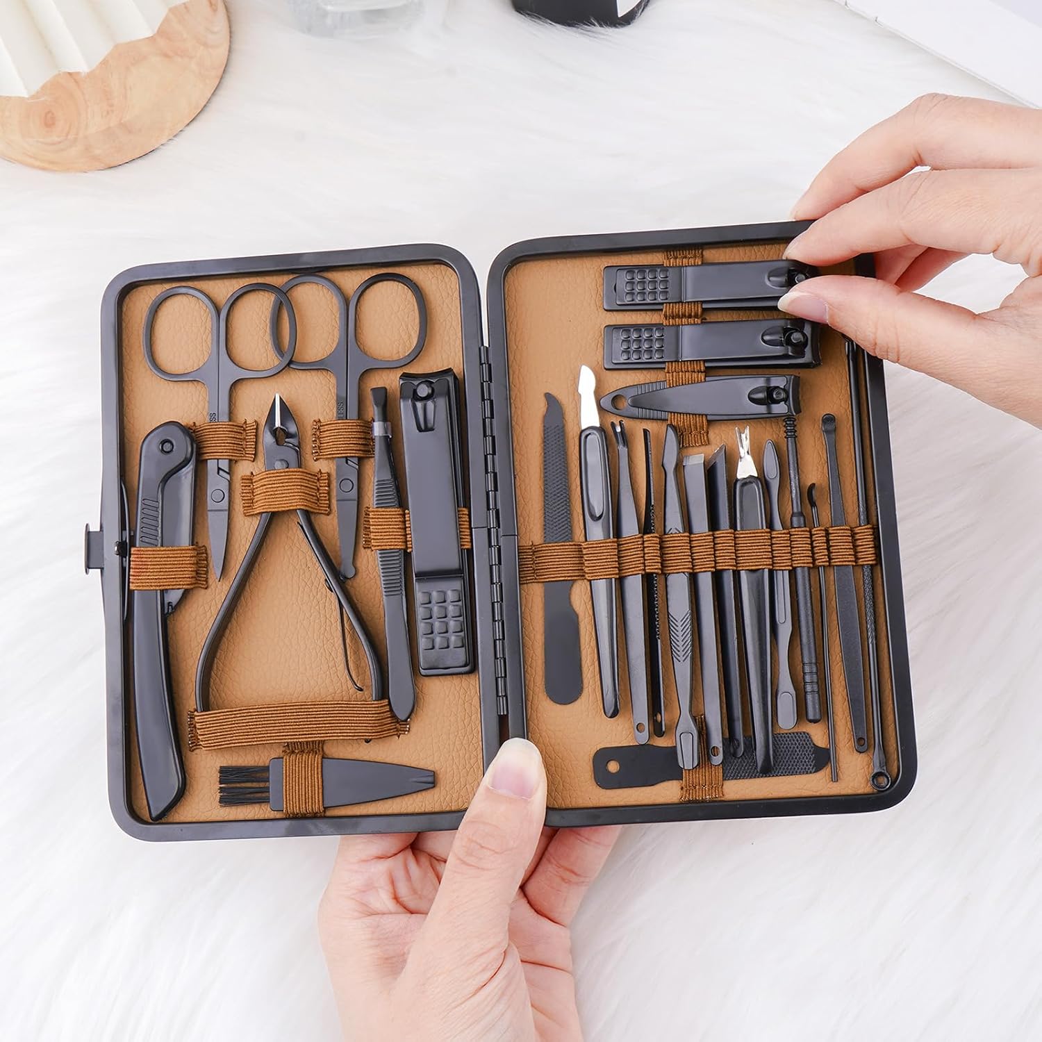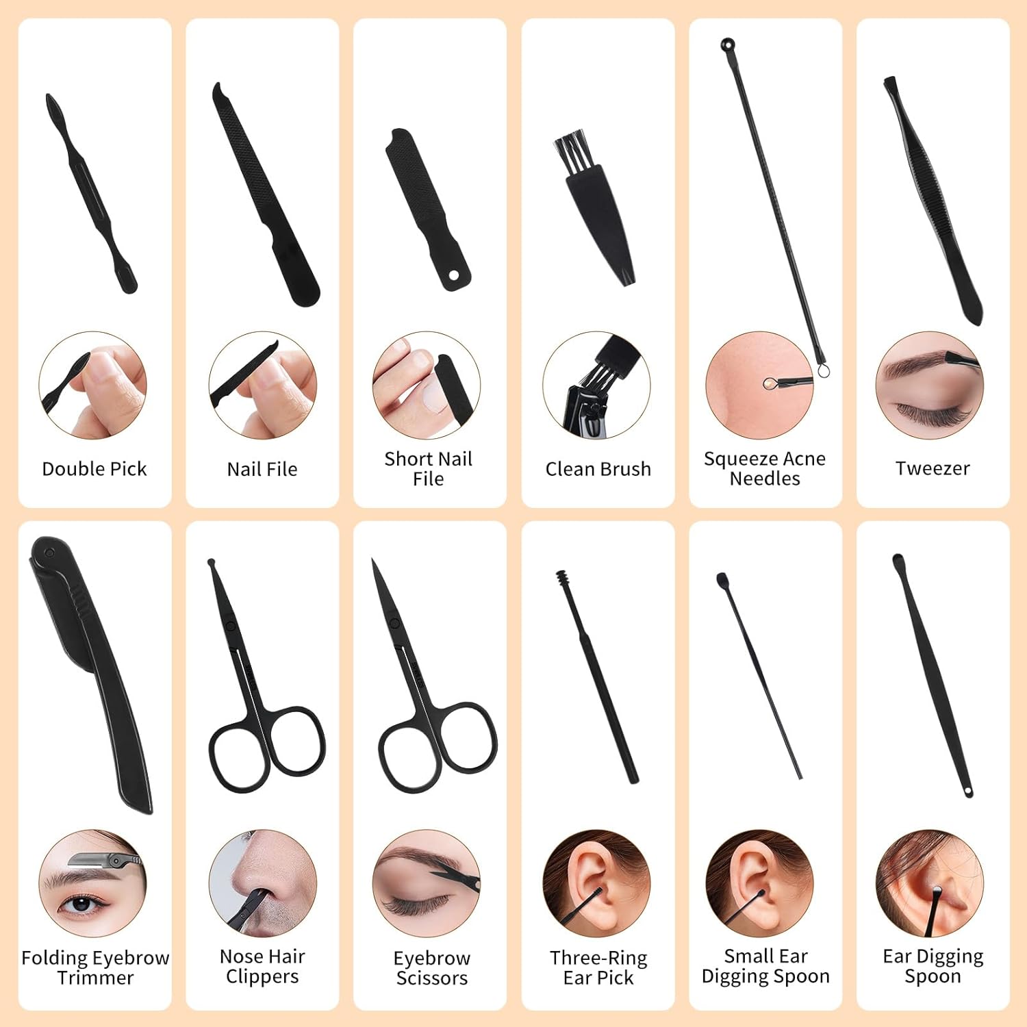 This multifunctional set includes tools for manicures, pedicures, eyebrow shaping, blackhead removal, exfoliation, and more—perfect for total-body grooming and personal care. -